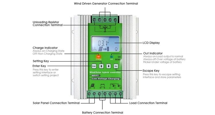 • ChẾ độ điều khiển: Sạc MPPT cho tuabin gió, sạc pin cho tấm pin năng lượng mặt trời
