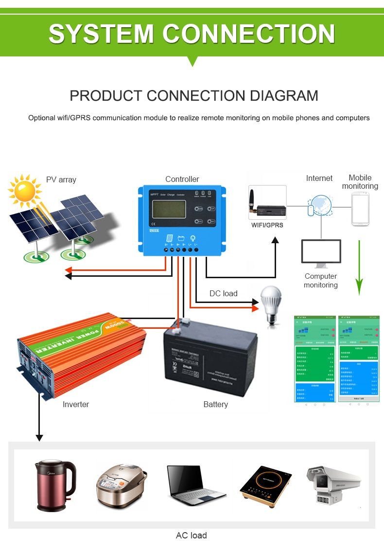 • Với chức năng phát hiện nhiệt độ bên trong, khi nhiệt độ của bộ điều khiển tăng lên 70 độ, bộ điều khiển sẽ giới hạn dòng sạc ở một nửa dòng định mức. Khi nhiệt độ đạt tới 90 độ, bộ điều khiển sẽ tắt sạc và đầu ra để kiểm soát nhiệt độ