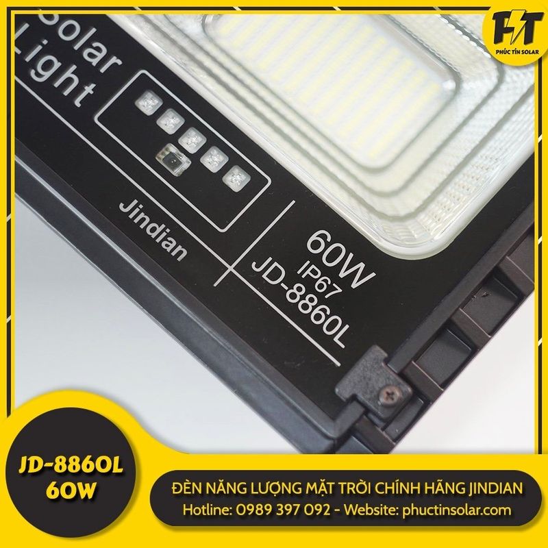 Mặt trước đèn led năng lượng mặt trời 60w JD-8860L có 5 nấc đèn báo phần trăm pin màu đỏ, mỗi đèn tương ứng với 20% pin, giúp người dùng biết được dung lượng pin của đèn còn lại. Khi đèn trong quá trình sạc thì các nấc đèn sẽ nhấp nháy cho đến khi sạc đầy. Thiết kế này của hãng nhằm đảm bảo cho người sử dụng biết được khi lắp đặt đúng cực hay chưa.