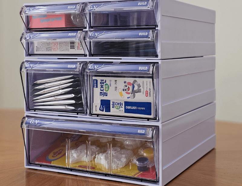 - Các ngăn kéo được làm bằng nhựa trong suốt, vì vậy bạn có thể kiểm tra bên trong mà không cần mở ngăn kéo. Có một thẻ ghi chú trên mỗi tay cầm để bạn có thể ghi tên sản phẩm cần lưu trữ.